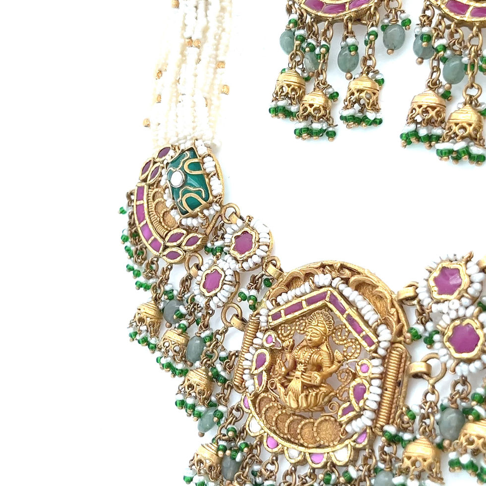 Harvi Antique Gold Necklace Set effortlessly combines tradition with delicate beauty. Adorned with antique look, its craftsmanship perfectly embodies the essence of new-age jewelry, offering a true reflection of modern-day style and elegance.