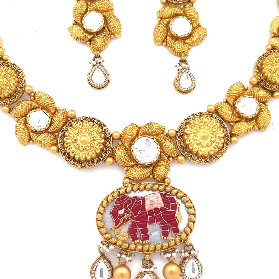 Inika Antique Gold Necklace Set effortlessly combines tradition with delicate beauty. Adorned with antique look, its craftsmanship perfectly embodies the essence of new-age jewelry, offering a true reflection of modern-day style and elegance.