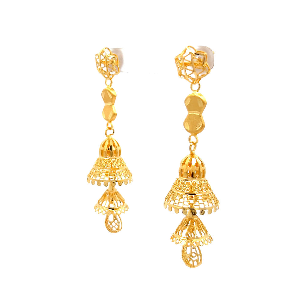 Indulge in effortless luxury with our Nyra Turkish Gold Jhumkis , meticulously crafted in solid 18kt gold by Jewelry Creations. Embrace the perfect blend of style and sophistication in this lightweight masterpiece.