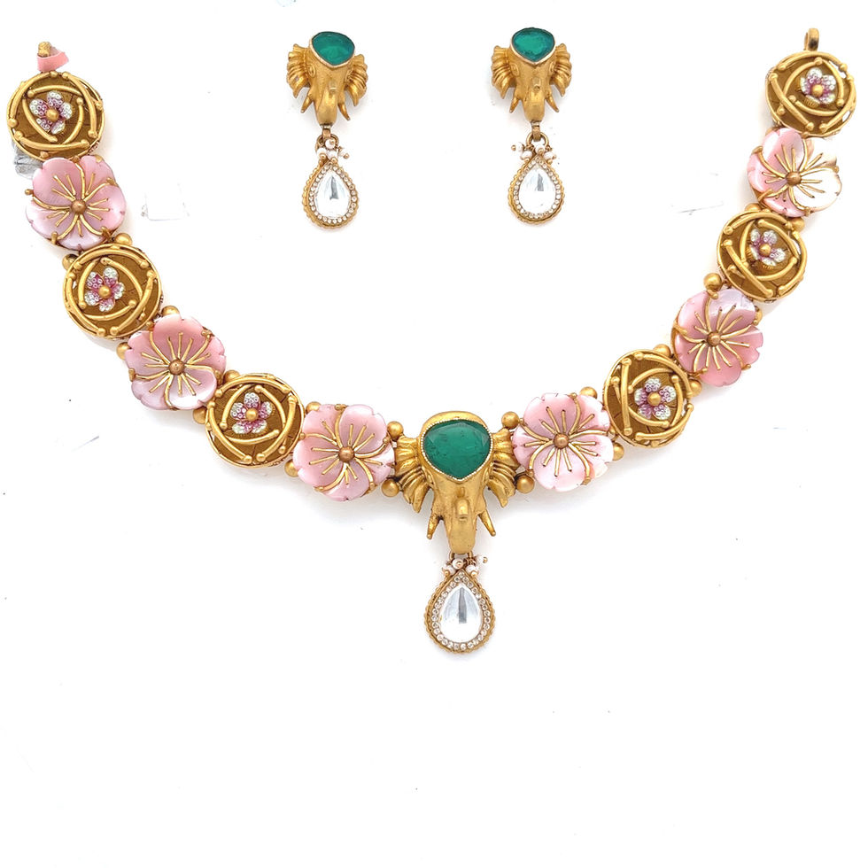 Paridhi Antique Gold Necklace Set effortlessly combines tradition with delicate beauty. Adorned with antique look, its craftsmanship perfectly embodies the essence of new-age jewelry, offering a true reflection of modern-day style and elegance.